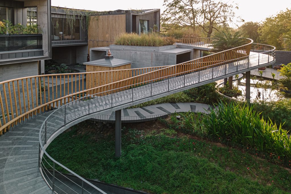 When space isn’t a constraint, the multigenerational living typology translates to more room for everyone—sometimes, even under two separate roofs. For a recent project in the heart of Ahmedabad, the city-based architecture and interior design studio OpenIdeas dipped into the metaphor of a bridge as a means to connect the homes of two generations. Spread across 22,000 square feet, the design accommodates two homes in different blocks—one for the client and another for his son. The undulating bridge crafted from exterior-grade Luna wood, concrete, and MS fabrication is visually striking and symbolic of the bridge between generations, ideologies, and experiences.