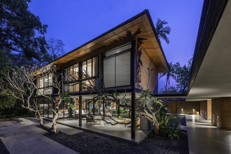 Helmed by ADND, ‘Casa Feliz’ is a 10,000-sq-ft home that dwells amidst existing trees and landscaped greenery on a two-acre site. Composed by its principal architect Shobhan Kothari, the existing trees and dense vegetation on site were left largely untouched for the sake of a squarish courtyard at the epicentre of the house — in a perennial homage to the practice of Tropical Modernism. “These spaces needed to be interactive and have an inside-outside connection,” Kothari explains. “We wanted to have the maximum amount of transparency to bring nature inside.” The eloquent interplay of textures inside Casa Feliz, and its grounded material palette of clay bricks and wood juxtaposed with metal elements bring in a touch of the contemporary.