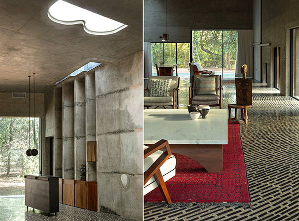 The custodianship of a lush mango orchard on site and the preservation of surrounding biodiversity was a significant concern for Rathod. Moreover, under the structural engineering of Sushil Singh from Studiostruct, small ducts were carved out within the thick concrete walls to harness the cool air and circulate it throughout the large volume of the 5000-sq-ft interiors. Much like an impasto of fossilised remains, the concrete walls of this house are moulded with debris from the site itself including broken brick, stone chips and large pieces of waste stone. The walls thus evolve into a thing of age-defying beauty, in part due to the manifold textures, but mainly because of the larger embedded stones that can remind us of the unceasing march of geological time.
