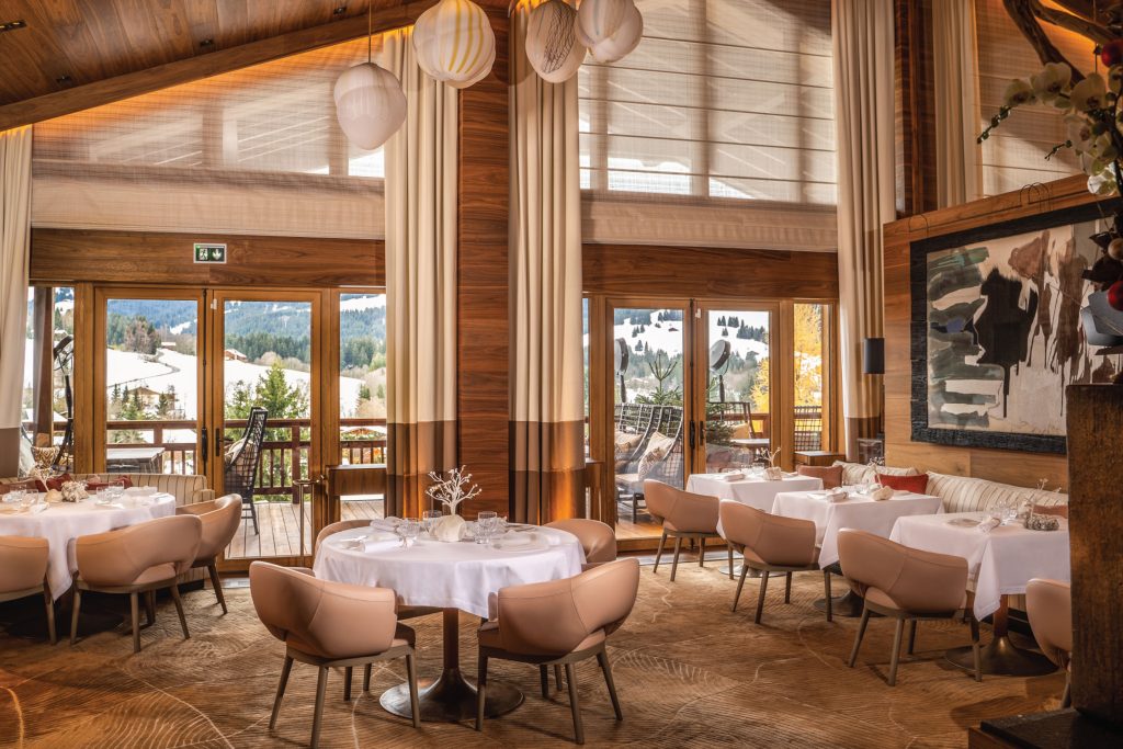 The rooms and suites come decked in an artful fusion of classic comfort, a restrained modern aesthetic and a flash of vibrant colours like Vesuvius orange, violets and chocolate brown that make it radiant. They come with signature Cheval Blanc mountain chic amenities like a private terrace or balcony with views of the mountains and a spacious powder room outfitted with a bathtub and hammam-rain shower equipped for chromotherapy. The Spa Cheval Blanc will enrobe you with ultimate relaxation treatments from Guerlain as wellness is of utmost importance here. The stunningly designed indoor pool is great for a warm soak while the outdoor Russian banya and hot tub help to warm chilly fatigued limbs post-ski sessions. Le 1947 Cheval Blanc, the only restaurant in Courchevel awarded three Michelin stars is the perfect venue for a post-ski celebratory dinner. The cigar yurt and the Le Restaurant which extends to a terrace dining framing the gorgeous Jardin Alpine sets you in the spirit for the Savoyard lifestyle.