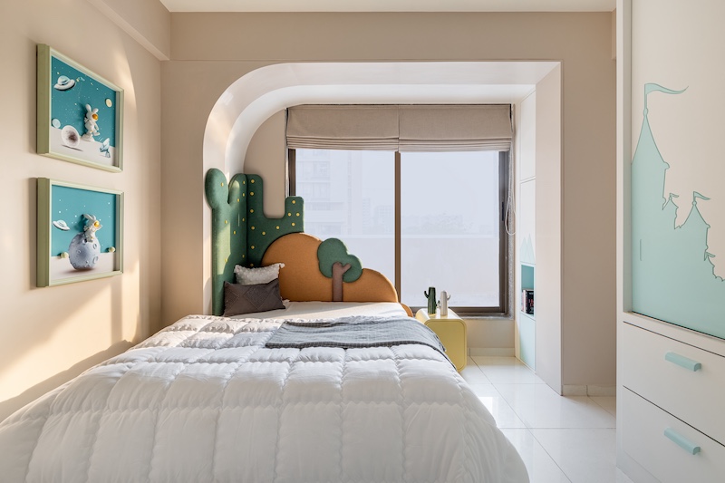 The choice of minimalist decor elements like space-inspired artwork, cloud-shaped wall shelves and handcrafted cacti, reflect a fascinating world full of fun and adventure. Despite the spatial limitation, the room is designed to feel open and airy through thoughtful furniture placement, multifunctional pieces and ample storage solutions. Every element reflects scrupulous planning, ensuring that this gleeful enclave evolves harmoniously with its young occupants.