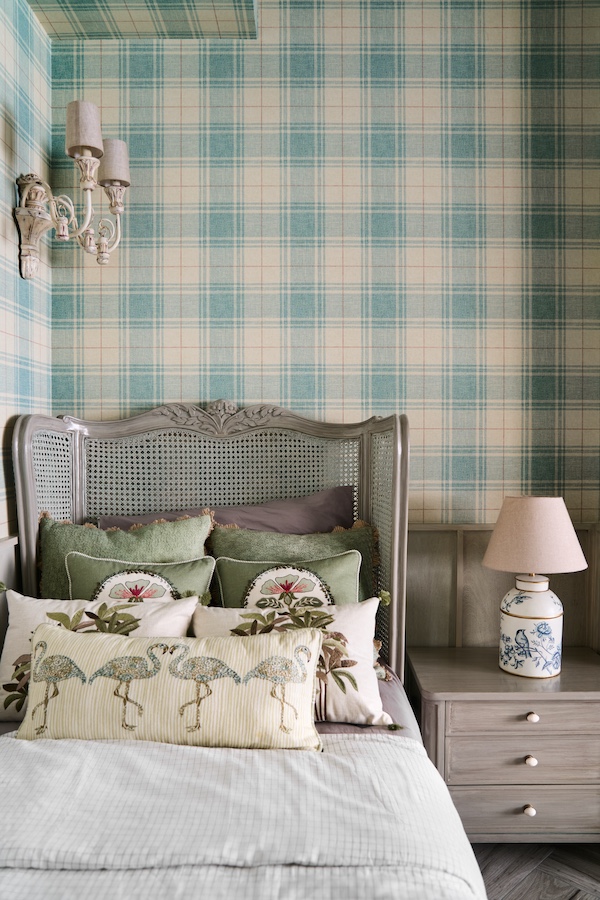 Echoing a cheerful vintage essence in a petite space, this particular bedroom in Mumbai helmed by Tejal Mathur possesses a charm akin to a dollhouse. Featuring a chest of drawers, a grey rattan bed crafted by Ironworks, and a mint pastel study unit – this room perfectly caters to its occupant’s every need. A sense of chic simplicity is present where a mint-checkered wallpaper leads the design within the space.