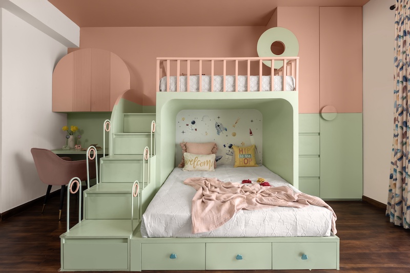 As vibrant as macarons and as sweet as a cupcake, this kid’s bedroom in Greater Noida is a whimsical design playground, with playful splashes of contrasting peach coral and mint sage green. Storey Tellers Design Studio has decked the chamber with an on-the-spot-built multifunctional unit: a desk, a curved bookshelf, and a bunk bed with steps leading to the upper bunk. At the far end, a wardrobe continues the playful colour scheme, with a visual line separating the minty green base from the warm coral top.