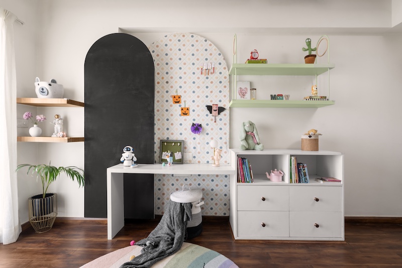 By embodying all things dainty sits a thoughtfully designed study area on the opposite side of the room. It features curved panels of blackboard and corkboard in a fun pattern. Every piece of furniture that makes this room endearing and calm, has been designed and crafted in-house. The room is a reflection of how playful furnishings and charming strokes of colour can capture the unique spirit of a child.