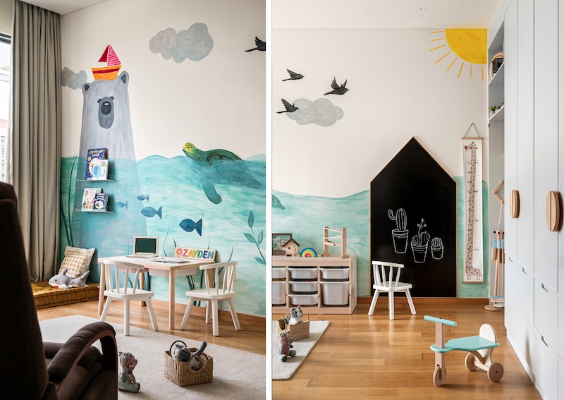 With a mission to accommodate sleepovers and comfort for all, Soul Space Design Studio crafts a marine wonder in Bangalore for a toddler fascinated with animals and aquatic creatures. Dominating the space is a vibrant floor-to-ceiling mural by Nishka Mehta that depicts the underwater world. Interactive features like a blackboard wall and an adorably scaled mirror are design ideas any child would adore. Ingenious storage solutions such as pull-out baskets and an intuitively organised PU-coated wardrobe maintain order amidst the lively chaos of toddlerhood.