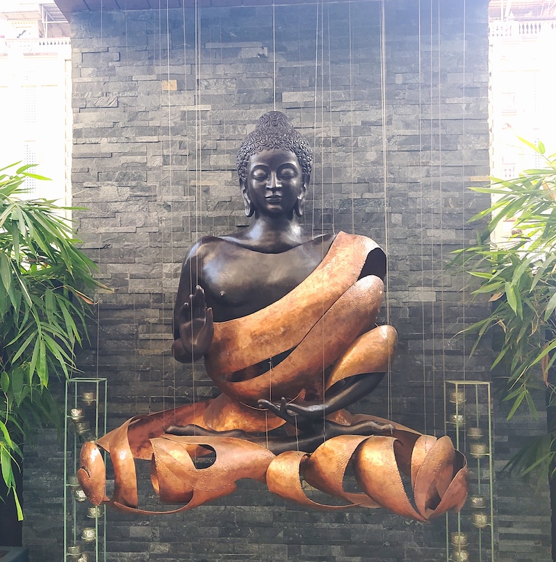 Khambatta’s distinctive process involves filing, moulding, welding and burning, resulting in works that thrive on dramatic contrasts. The cast bronze body is offset with the hammered copper robes, orchestrating a visual harmony and capturing stillness and movement simultaneously. When the wind blows, this sculpture produces a soft clang, transforming ‘Gautama’ into a windchime of serenity.