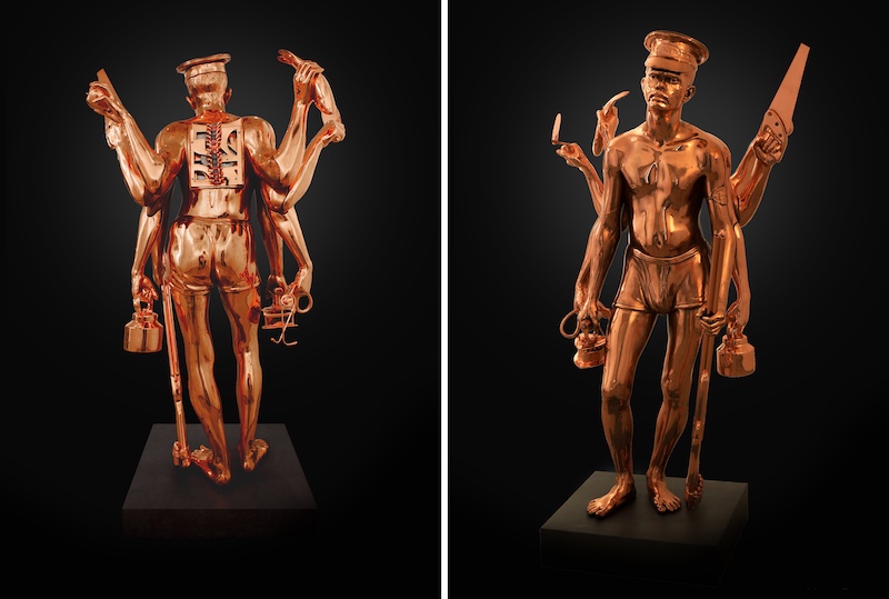 Commissioned by architect Ankit Mittal for his studio, Deval Verma’s ‘The Modern Vishwakarma’ (2022) memorializes the eponymous Hindu craftsman deity, in a heartfelt paean to the spirit of creation and engineering. Made from an eclectic mix of spare tools, machinery parts and industrial scraps, the piece blends mythology with a mindful, sustainable outlook.Â