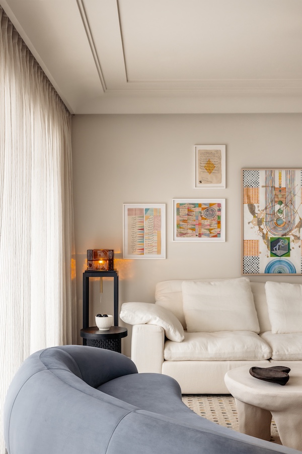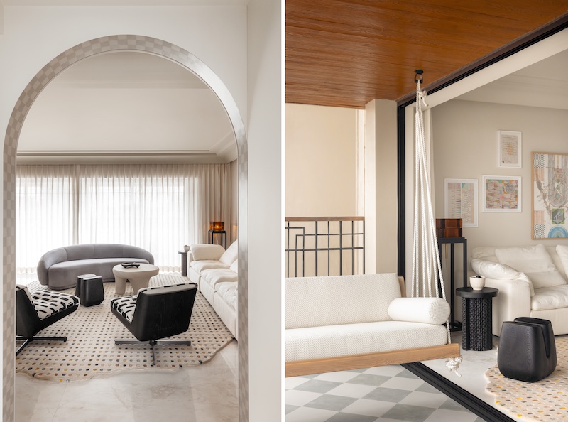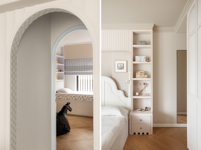 Beyond the living area lies a poetic passage akin to a vessel for air to glide through, seamlessly linking spaces throughout the home. Along this trail, an arch—a recurring motif in the firms’ projects— juts out, framing a chic kid’s bedroom. Referencing this reimagined piece of traditional history, Vaid muses, “Its inspiration traces back to the creation of the Dori Patti object, where the idea of seamlessly weaving this form into our spaces first emerged.”