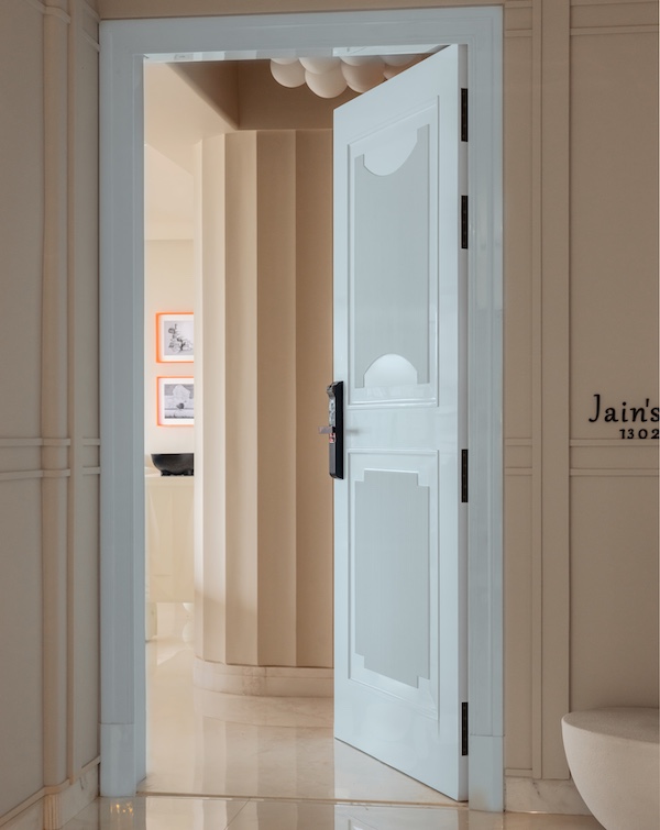 This archway unveils a charming haven—a kid’s bedroom adorned with pin-stripped wallpaper, warm wooden flooring and a bed nestled by a window framing enchanting cityscape views. Building upon this subdued cottage-core ambience, a second bedroom emerges, embellished with an arched headboard framed by cabinets to exhibit the cute learnings. Vaid notes, “Hand-painted wardrobe panels, custom lacquer finishes, and playful details make these rooms a true reflection of youthful energy and imagination.”