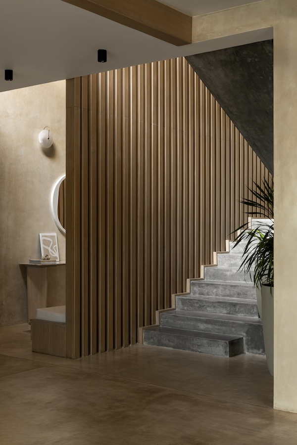 The 4,500-sq-ft apartment came fitted with complete washrooms and finished flooring tiles. Preferring to work with a clean slate, the team stripped the home down to its bare shell. They also reoriented the original staircase at the entrance to create a more welcoming entryway by demolishing the first few steps and reconfiguring it into a dog-legged design. Extraordinary light and height enhance the entry foyer simplistically. A subtle barrier between the foyer and staircase, the double-height wooden louvres add a rich layer of cosiness and fire up the play of light and shadows at different times of the day.