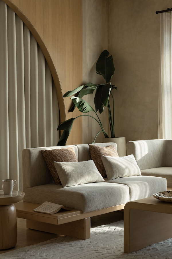 The formal living room is flanked by a balcony that brings in views of the outside world. Its muted colour palette of light browns and taupes revels in a pared-back aesthetic where less is more. “The blend of light tones with textured finishes in Japandi design seemed like the perfect match for what the clients were looking for. And we weren’t wrong—they instantly embraced the theme, knowing it would create the serene, minimalist atmosphere they desired,” says Ramesh