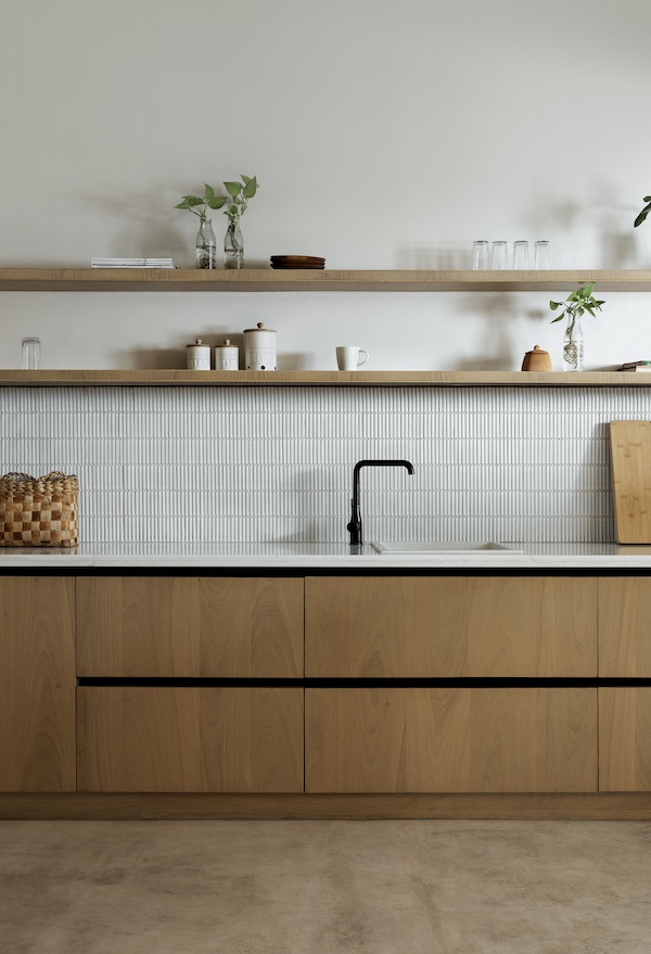 Light wood veneer on custom cabinets lends the kitchen a warm touch, while open shelves make the room appear more spacious. (Image Credits: Phosart Studio)
