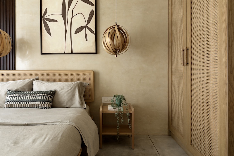 The highlight of this project is undoubtedly the master bedroom where the art of minimalism truly comes into play. An IPS wall finish instantly adds a zen-like dimension to this room where beauty lies in the finest of details. The bedroom’s balcony was incorporated into the layout of the room, beyond arched openings, creating a cosy nook to soak in some sunshine. “The arches helped us balance the clean lines of Japandi design with a bit of timeless warmth and charm,” says Ramesh. To address the issue of heat from the west-facing windows, the ceiling of the nook was finished with bamboo mats that serve the dual purpose of adding a warm, cosy touch.