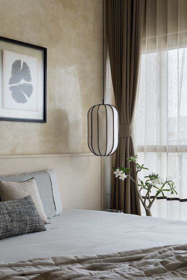 A concealed door in the dining room leads to a guest bedroom with beige tones and rattan accents on bespoke furniture pieces. The pendant lights are by Mianzi and the art is custom-made. (Image Credits: Phosart Studio)