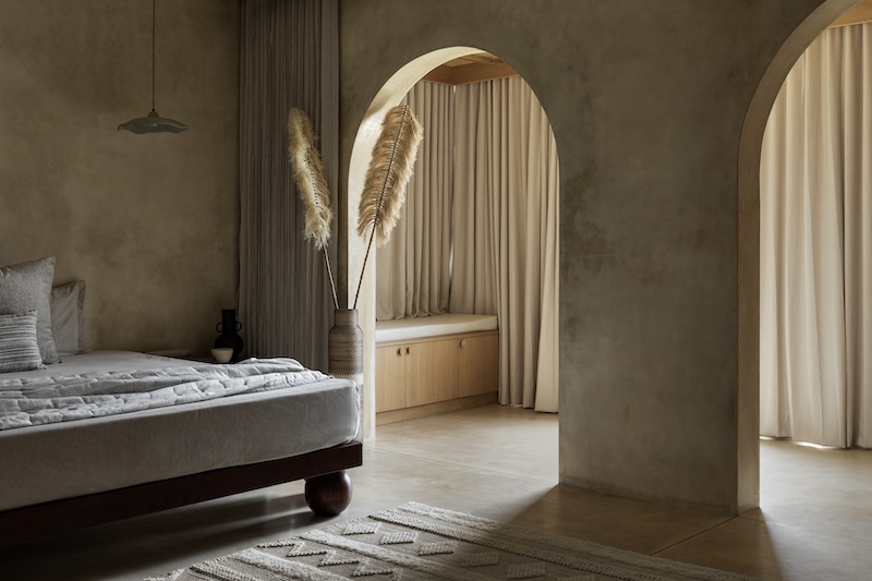 The ceiling of the master bedroom is a clever fusion of form and function that once again leans into the overarching aesthetic of the home. “This bedroom had a great ceiling height and we wanted to make the most of it while sticking to our minimalism theme. To keep things clean and simple, we introduced gentle curves to the ceiling by adding a series of small arches with wooden rafters running between them,” says Ramesh.