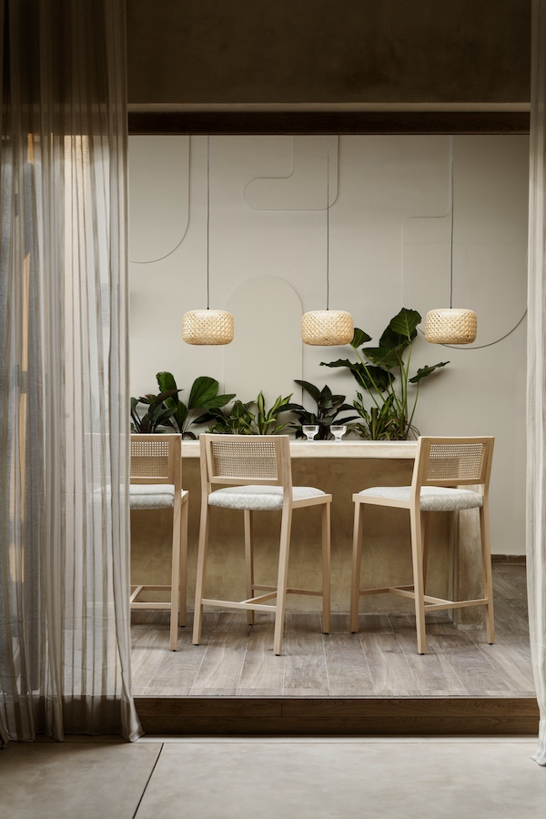 The dining room’s rattan chairs and art are bespoke. The wooden wall sconces and pendant lights are also custom-made. (Image Credits: Phosart Studio)