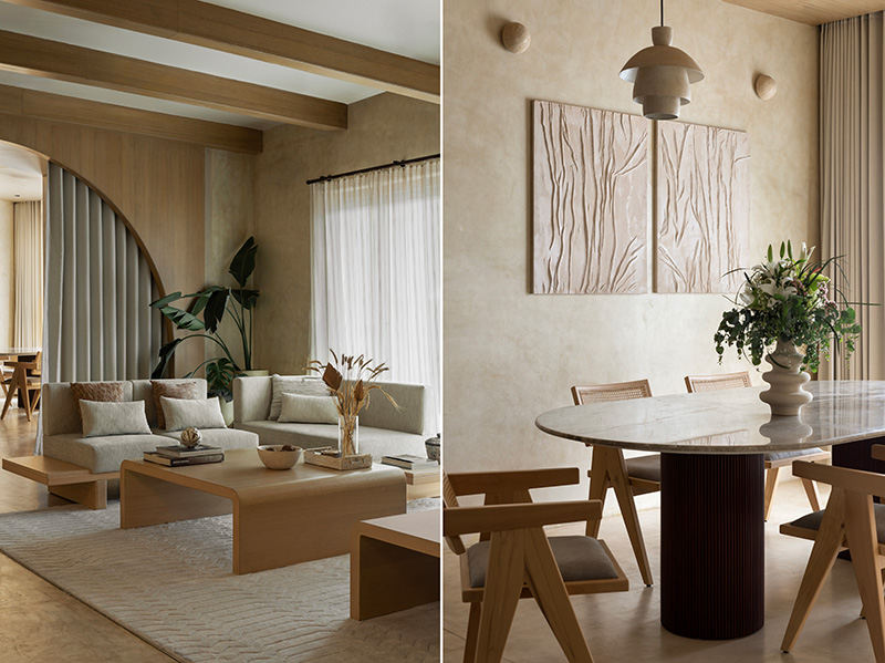 The adjacent dining room is well within view from the living room, yet distinguished as an intimate space of its own. To create a sense of separation without sacrificing the open flow and airy layout, a wooden arched partition becomes both a functional and aesthetic element that frames the dining room. “The arches in this home were all about adding a sense of softness and warmth to the spaces. We wanted to weave in those soft, curved lines wherever we could. In the living room, the arched openings gently frame the dining area, creating a smooth flow between the spaces. It’s a simple touch but it brings in a sense of calm and elegance,” says Ramesh.