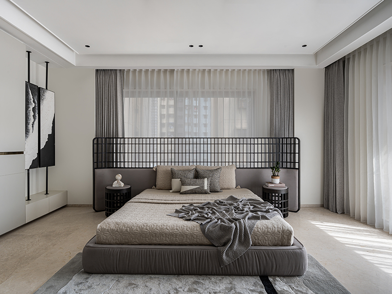 The master bedroom is a cleanly designed contemporary space peppered with art and thoughtfully considered textures introduced by way of furniture and furnishings. A teakwood bed makes for a statement piece with its classic headboard crafted from fabric and wood. Subtle swatches of taupe provide the perfect backdrop for layered graphite-hued textiles and wood furniture painted to a darker shade of grey.