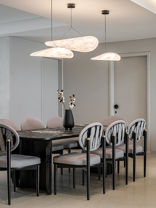 Despite the decidedly muted use of monochromatic tones—and, thanks to the application of rich materiality—a dialogue of contrast and harmony runs effortlessly across the three-bedroom apartment dubbed ‘The Hued Home.’ Ingeniously envisioned from the generously sized living room right up to the private spaces, Braganza’s design approach transcends trends to champion innate luxury, style, and modernity. “Meeting the client’s needs without going overboard—it required a delicate balance of restraint and creativity, knowing precisely where to draw the design to a close and to ensure their satisfaction without excessive embellishment,” says the designer.