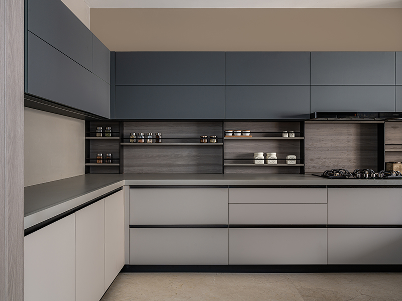 With functionality at its core, the apartment offers ease of access and simplicity at every turn. In the ultra-sleek kitchen, clean and sharp lines stand out as intentional inclusions in an uncluttered space. A mix of open shelves and glass storage units offer accessibility and ample storage solutions, ensuring that every kitchen item enjoys its own space.