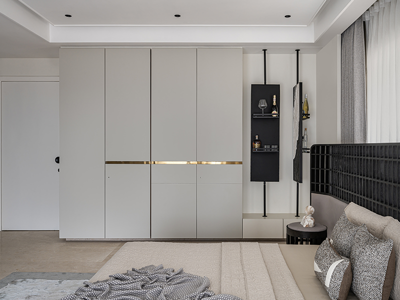 Welcoming to natural light that pours in through large windows, this private space is kitted out with a cutting-edge projector and can quite effortlessly transform into a haven for the ultimate cinematic experience. A crisply designed wardrobe with metal accents stands adjacent to a bar that cleverly reveals itself when rotated. On any other day, one would never guess that a well-stocked bar lies behind the stunning monochrome artwork sourced from Artifest.