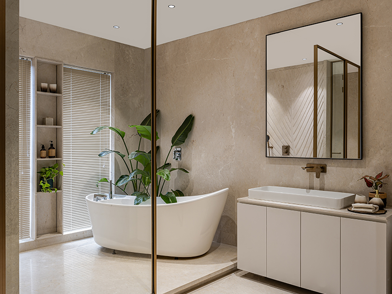 The master bath is yet another sun-speckled space that beautifully embraces the blend of functionality and aesthetics. Well ventilated and decked in local marble, this luxurious sanctuary features a free-standing angled tub and a wardrobe most would vie for. Indoor plants refresh this neutral-toned space, and a partition marble wall etched with palm leaves completes the tropical ambience.