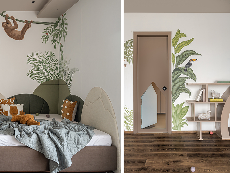 The children’s bedroom oozes playfulness and functionality all at the same time. Bragranza infused this space with exceptionally well-considered design details––from the warm wooden flooring to the little door seamlessly incorporated within the larger toilet door, providing the twin siblings with their own entrance! A hand painted jungle-themed mural, the vibrant result of eight days of dedicated artistry, runs across the room. Elsewhere, a study table houses rotating box shelves that cleverly hold learning material for a clutter-free space.