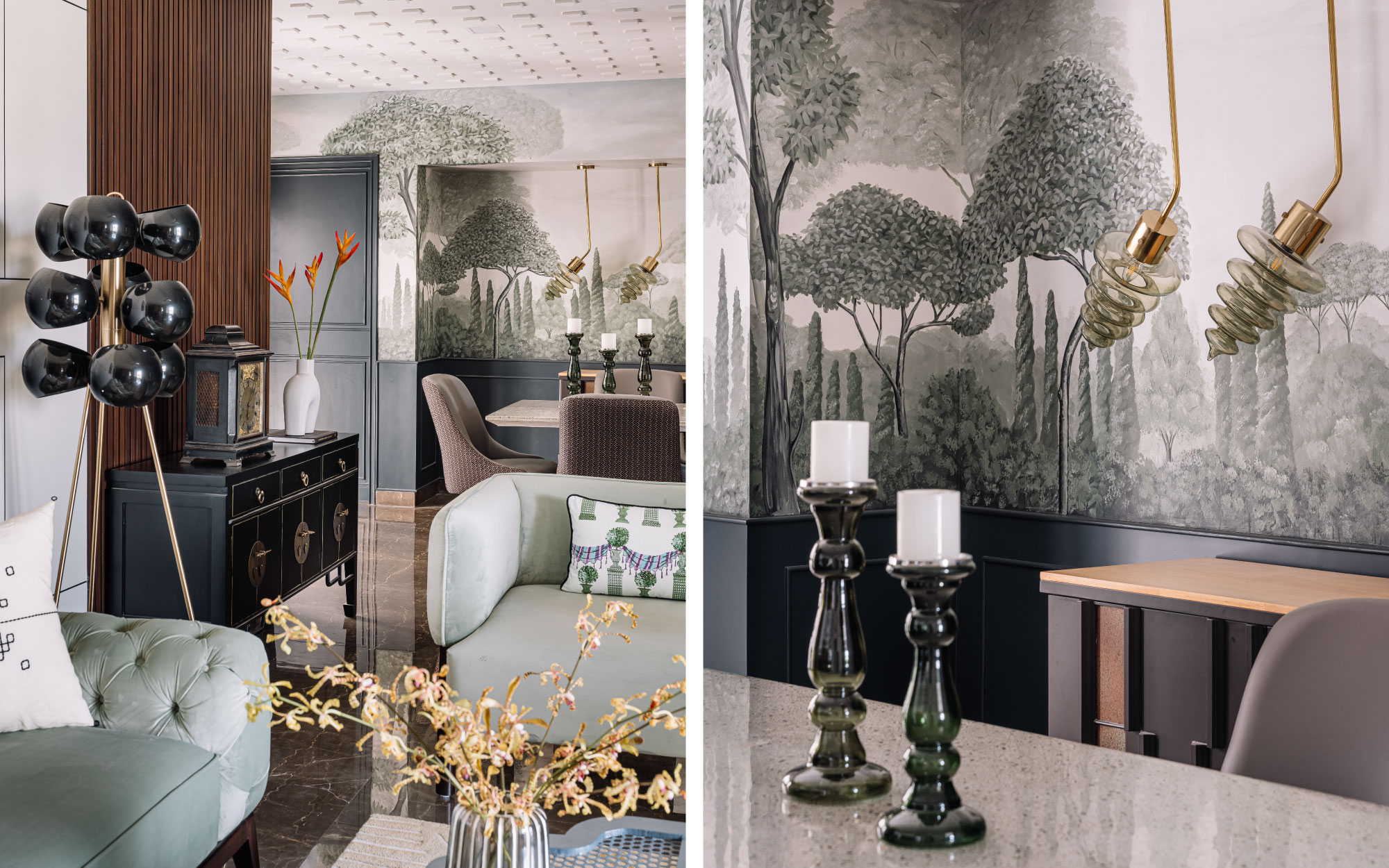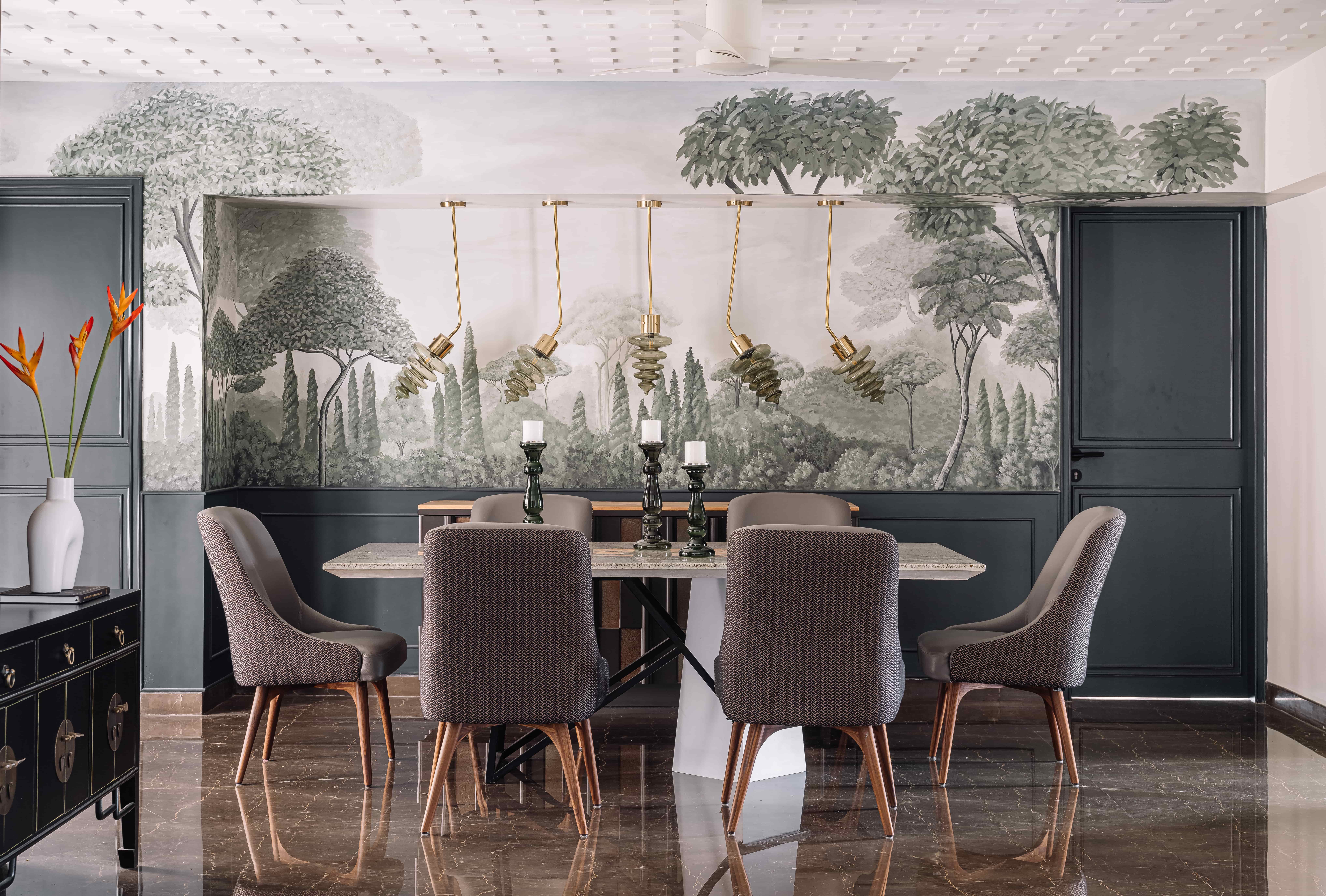 Moreover, the dining area stands out as the most enjoyable space for Agarwal to have conceptualised. “I truly enjoyed designing the dining area, the hand-painted mural by local artist Gautam became the visual centrepiece, so lifelike it almost seems ready to leap from the wall,” adds Farah Agarwal, the founder and principal of Chestnut Storeys. “The most challenging space was the entrance passage, because of the lack of natural light. Transforming it with warm wooden panelling into a welcoming approach ended up being one of the most rewarding elements.”