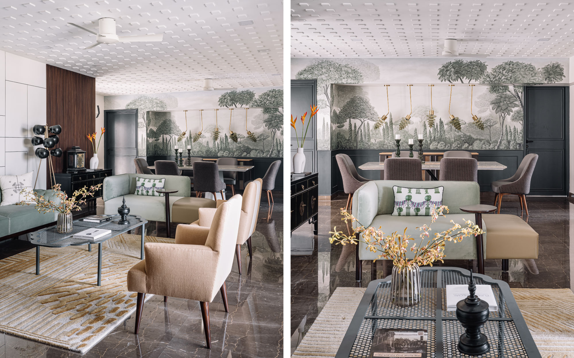 In the formal living and dining spaces, the home’s core design philosophy of ‘Panels, Patterns, and Purpose’ is immediately showcased. Here, an embossed square-tessellated ceiling casts a dynamic play of light and shadow, a geometric rhythm echoed in the clean, angular furniture. A seafoam velvet sofa from Studio Ochre, paired with Gulmohar Lane armchairs and grounded by a Jaipur Rugs carpet, establishes a chic colour palette. The dining space, in particular, becomes a visual focal area with a hand-painted mural by local artist Gautam.