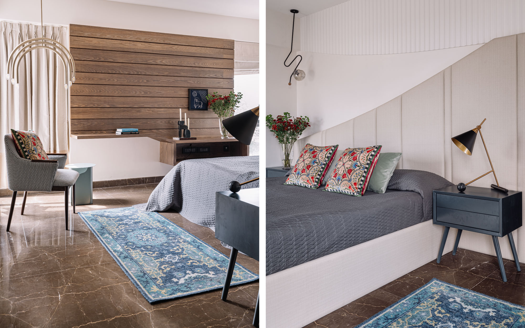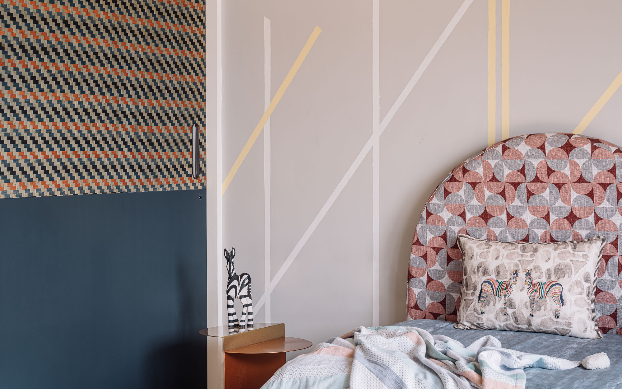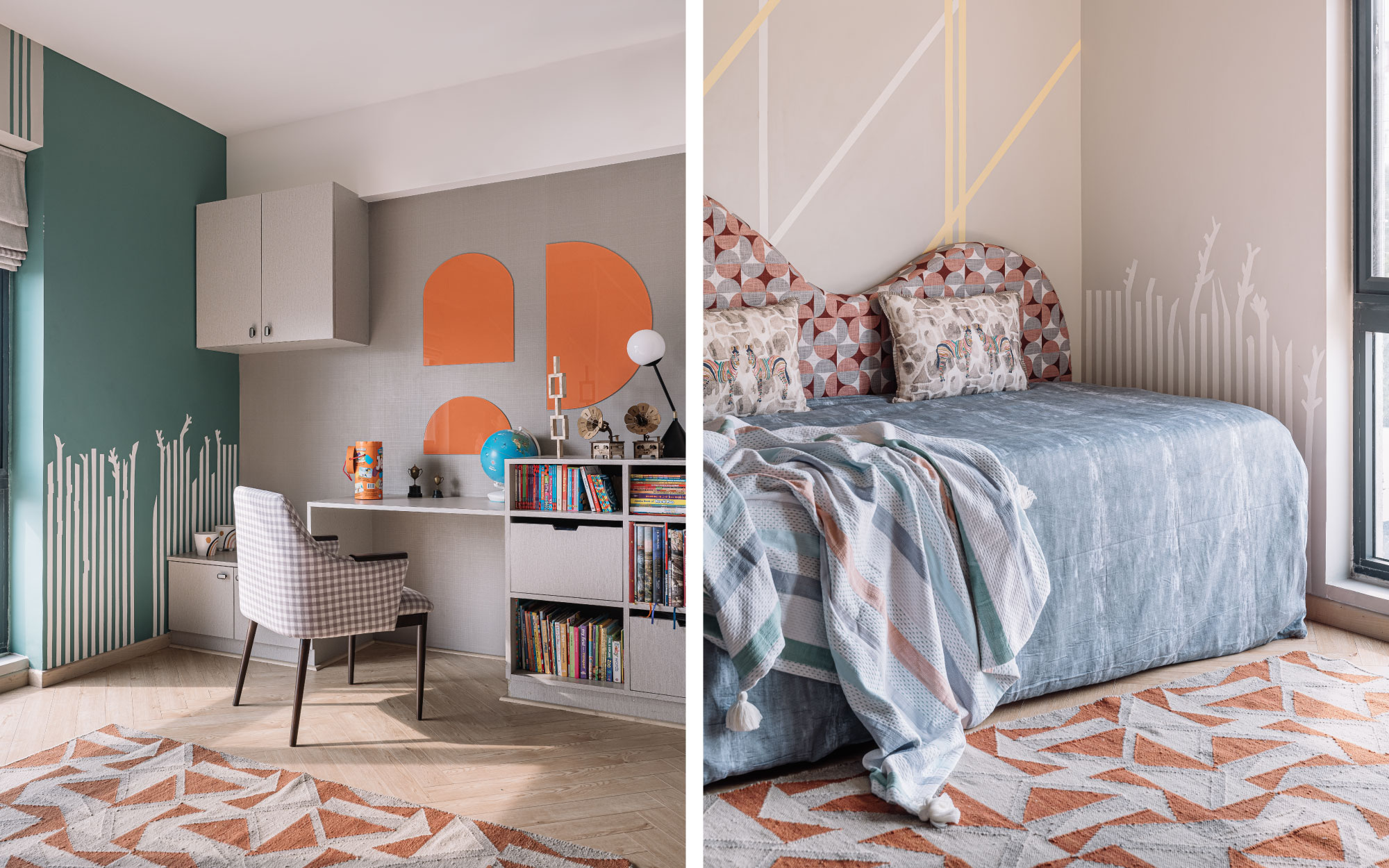 Moving into the private spaces, each bedroom reveals its own unique personality while remaining true to the home’s overarching theme. The primary bedroom finds its balance in arches and lines, with a neutral headboard anchoring a quiet, tranquil space. In contrast, the children’s bedroom bursts with a playful energy, boasting a colourful scheme of orange, blue, and green, a chalkboard veneer wardrobe, and a geometric headboard. The guest bedroom, on the other hand, experiments with arcs, from a curved headboard and fluted embossing to an arc chandelier, creating a layered, sculptural effect that feels both distinctive and harmonious.