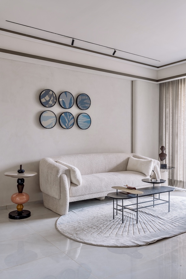 The architects break down traditional barriers, creating a continuous flow between the living, dining, and kitchen areas. This seamless integration allows for greater movement and visual connectivity, enhancing the feeling of space while maintaining a distinct identity for each zone. Doors were removed, sightlines cleared, and natural light harnessed to carve out a sense of airiness—a design move that elevates the apartment from typical to transcendent. Moreover, each space feels meticulously sculpted to prioritise fluid movement and emotional comfort. “Our goal was to optimise the use of space and furniture,” Gajjar explains, “ensuring each area feels balanced without being cluttered or empty.”