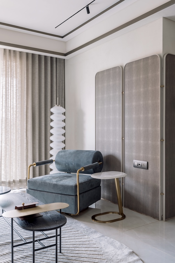 Moving through the apartment, the narrative shifts from communal spaces to more private realms. The first master bedroom, a sanctuary of calm, is defined by its scrupulous design choices. “The CNC anodized patta on the feature wall is a statement piece,” Gajjar shares. “This thoughtful detail shines with the gracefully curved crown moulding, which cleverly hides the structural beam and adds a sculptural touch to the space.” The stepped ceiling, with a subtle C-channel embellishment, elevates the space without overpowering it.