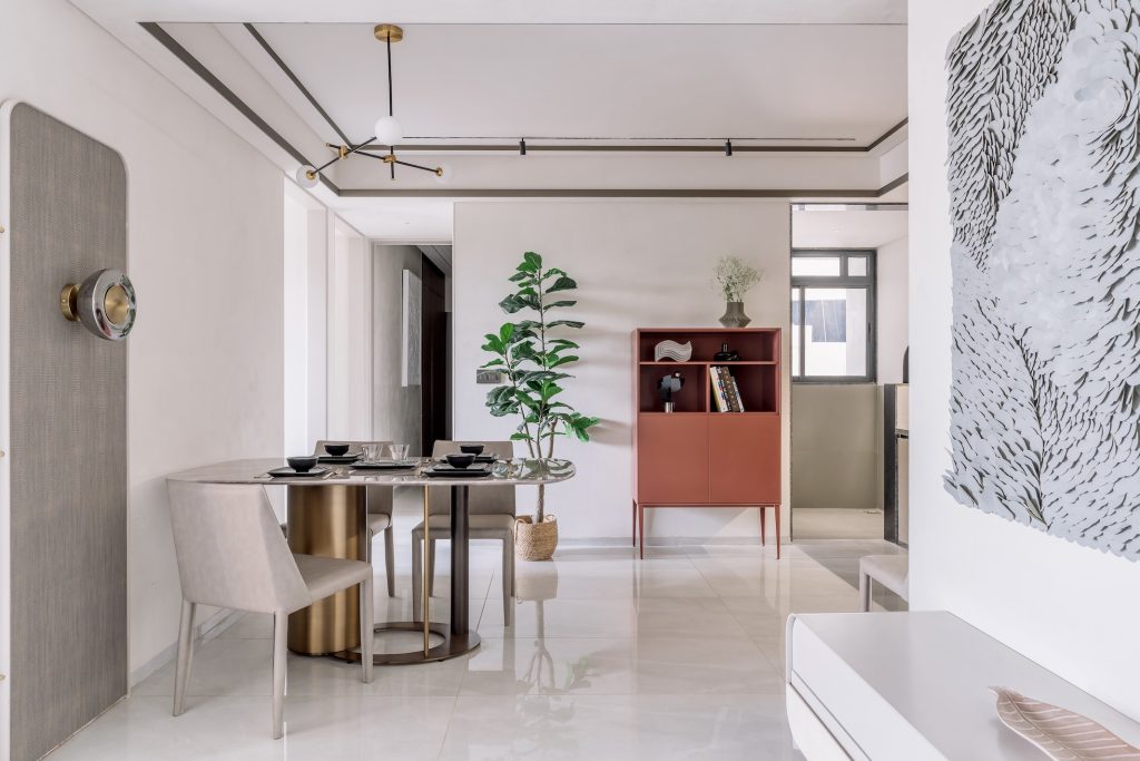 Our journey begins in the living room, where the recessed ceiling with its clean lines and geometric angles, introduces a striking contrast to the fluid shapes of the furniture. Lime-textured walls anchor the room, while carefully placed custom artwork becomes the focal point. Segueing into the dining area, an air of poised sophistication unfurls, highlighted by an Italian-style, terracotta-hued sideboard cabinet and lush indoor plants. The connection between the two spaces is further enhanced with dyed veneer wall panels, succinctly blending form and function.