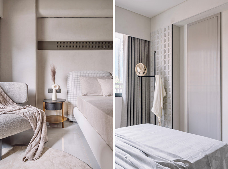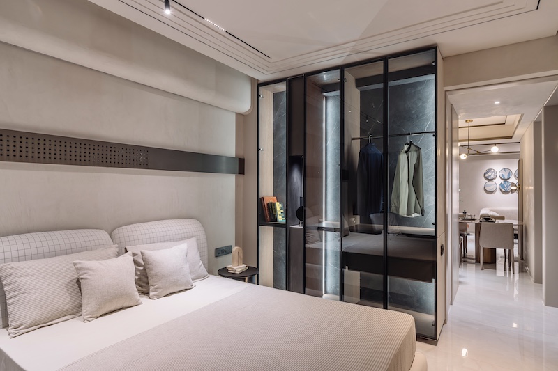 The second master bedroom offers a more restrained, classical atmosphere. Here, a CNC pattern above the bed and the opposite wall emerges as the defining element. The transparent modular wardrobe injects robustness, not only serving as a functional storage solution but also introducing depth and visual interest.