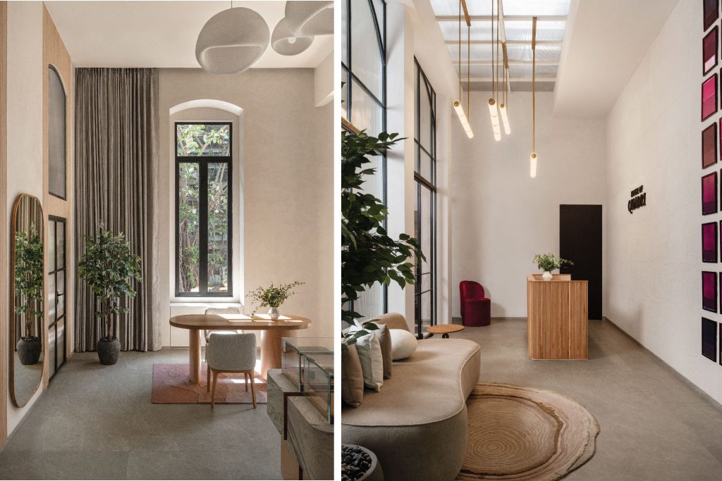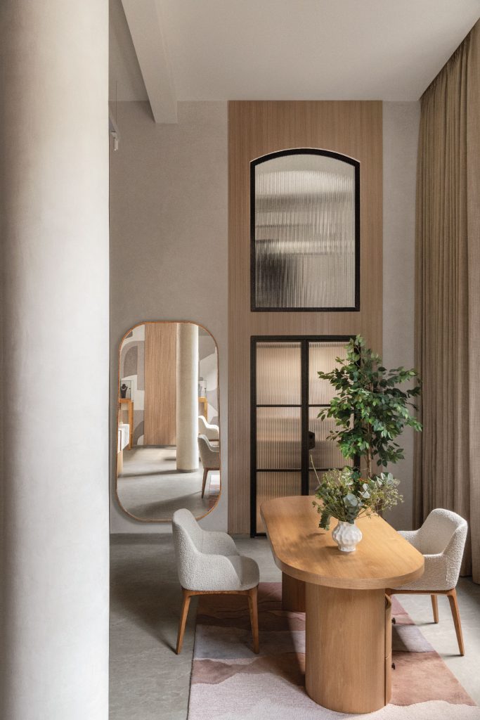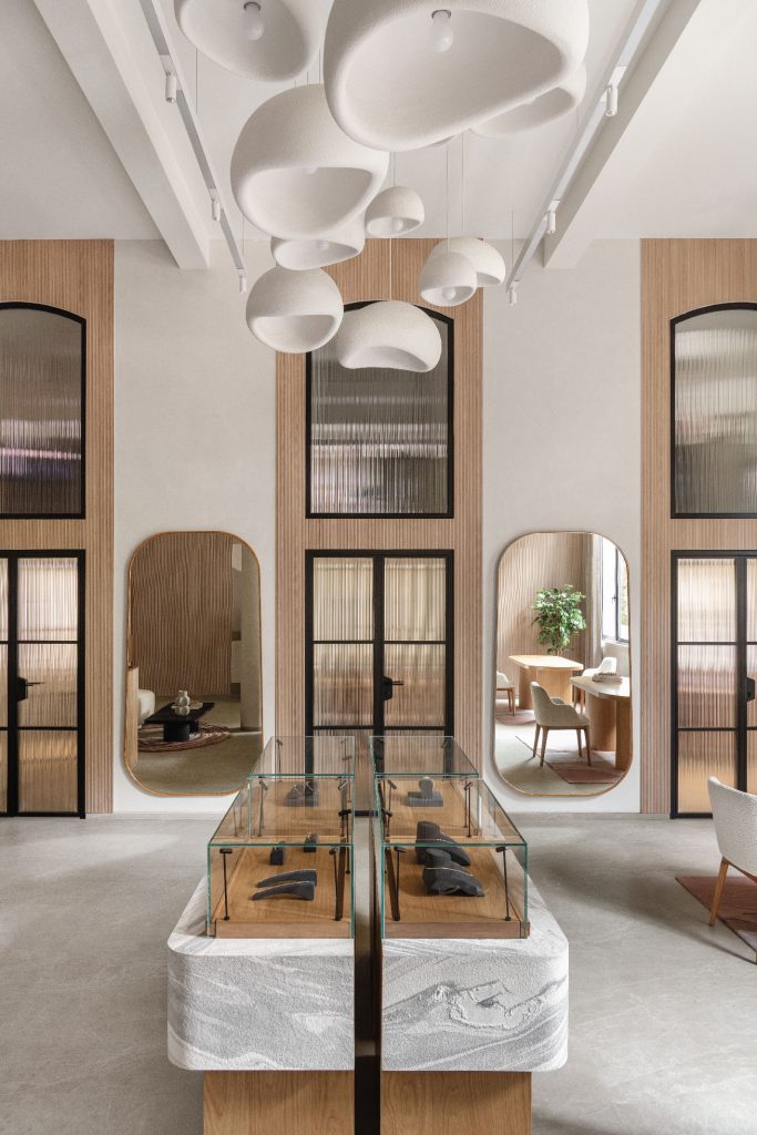 With design details that convey comfort, warmth and understated glamour, the reception all at once sets the tone for the retail experience to follow. A white curvilinear sofa by Bareeki is a chic pairing with a wooden table by Josmo Studio and an earthy hand-tufted rug by Loops by LJ inspired by the rhythmic patterns of tree rings. Stone flooring, lime-plaster walls and warming wooden accents work in cohesion in this tactile–rich space. The vitrified floor tiles are from Nexion, the textured paint is by Neocoats, and the wall tiles by MCM cladding.