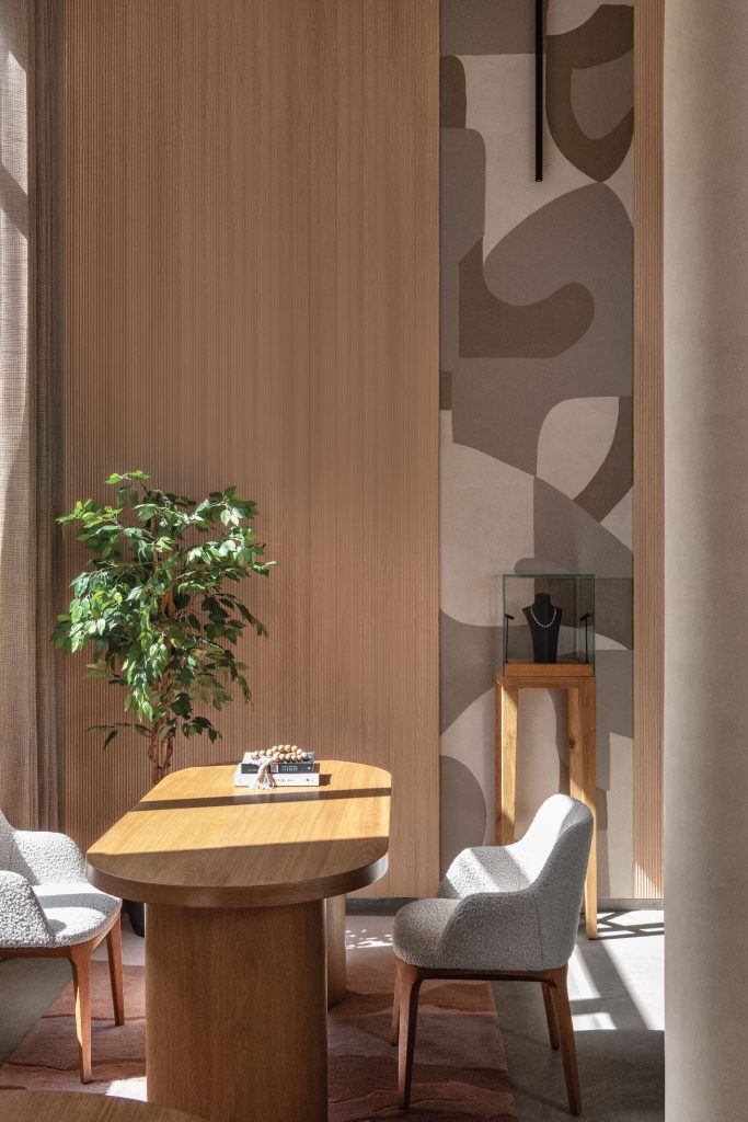 To add to the fluidity of the store, the wall panels were interspersed with an abstract hand-painted mural by Rudranee Chiman composed of organic, flowing forms in soft, earthy tones of beige, taupe and warm browns—a design element introduced after the store design and execution had been completed. Kumar found herself looking for that missing detail—a striking yet sophisticated backdrop to the clean-cut jewelry displays; motifs that would add depth and character to the space without overpowering the senses. “The motifs introduce a contemporary layer of artistry, adding depth, rhythm and movement to the otherwise calm backdrop. Together, the wood and patterned mural create a balanced visual rhythm that ties the space together sophisticated yet approachable,” says Kumar.