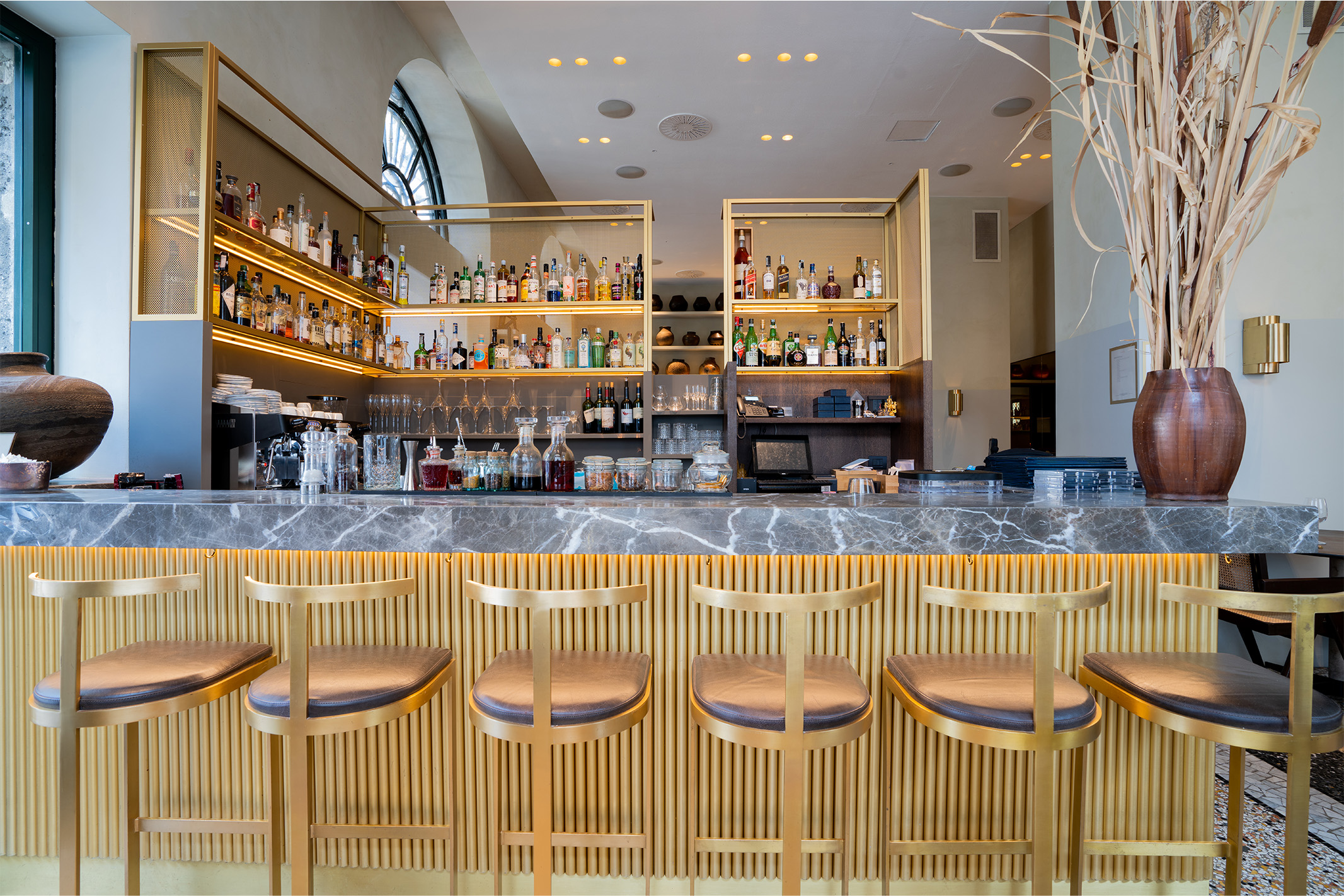 The layout of the restaurant includes a central bar area with a marble countertop and gold-accented stools, which creates a focal point. The dining area is characterised by minimalist wooden furniture, plush seating, and soft lighting, offering a comfortable yet upscale atmosphere. Large arched windows allow natural light to flood the space, enhancing its airy and inviting ambience.