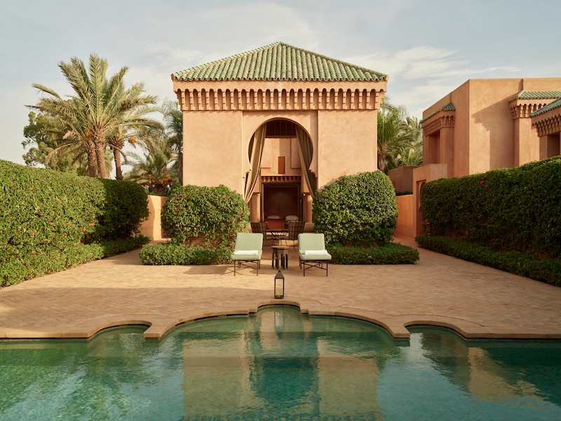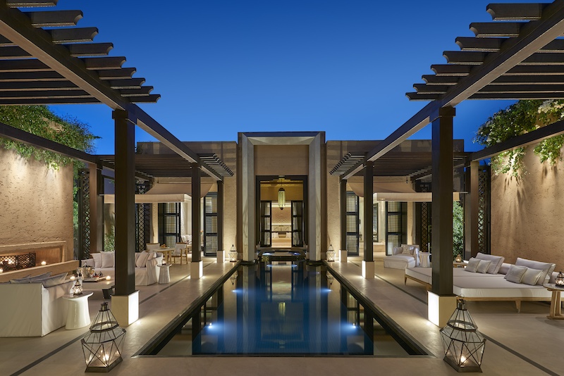 A new contender to the glamorous hotel scene of Marrakech, The Oberoi Marrakech is a palatial retreat designed by architect Patrick Collier, who undertook the monumental task of resurrecting the refined elegance of an Indian palace. Decked out in Carrara marble and zellige tiles, its grounds sprawl endlessly, around a gargantuan courtyard and gleaming grand canal water feature that runs through the length of the resort. The Indian hospitality brand modelled the property inspired by the 14th-century Ben Youssef Madrasa of Marrakech. The property features 78 rooms and suites designed with inspiration from Berber and Moorish architecture. The most spectacular view is of the ‘Royal Suite’, which mirrors magnificent views of the Atlas Mountains from the first floor of the opulent suite terrace. The suites and villas blend contemporary style with traditional Moroccan charm, adorned with a subtle palette of muted ivory and burnished gold.Â