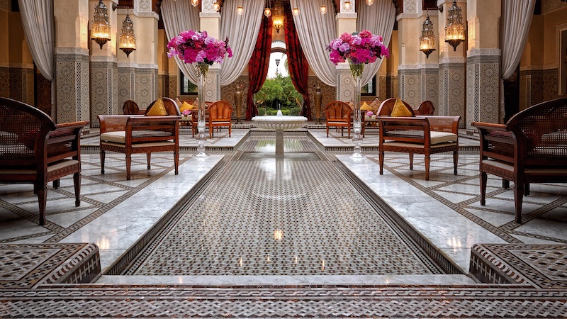 The lobby’s grand showcase of zellige work, wooden features, stucco walls, and fabrics opens a window into Moroccan art de vivre. (Image Credit: Royal Mansour Marrakech)