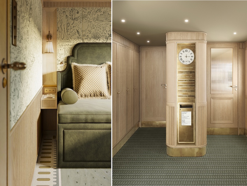 The powder room and wellness suite offer their moments of beauty, showcasing unique shell art by Mel Campion inspired by marine plants. Here, a soothing blue palette, stylish marble countertops, and flooring that mimics fossilized limestone create a calming, yet chic, retreat. Luke Edward Hall’s artworks, scattered across the cabin suites, evoke the serenity of the English countryside while nodding to European art history’s aesthetic movements. Though undeniably English in their charm and elegance, the interiors are also inspired by the landscapes passengers may encounter on their travels. Earthy tones and green accents echo the countryside views, blending the inside with the out.