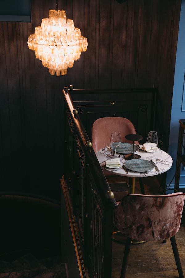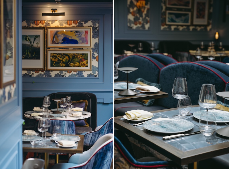 With blue wainscoted walls, and velvety upholstery paired with hints of white, the foundational floor is a nod to beginnings steeped in nostalgia. Perched above, the mezzanine with warm auburn hues offers a window into traditional cooking, with an open kitchen allowing patrons to peer into the process of chefs as they craft culinary chefs-d’oeuvre. Mimicking the interplay of shadows on the sunlit ridges of the mountains, this floor overlooks the ground floor, sustaining a connection between the two floors.