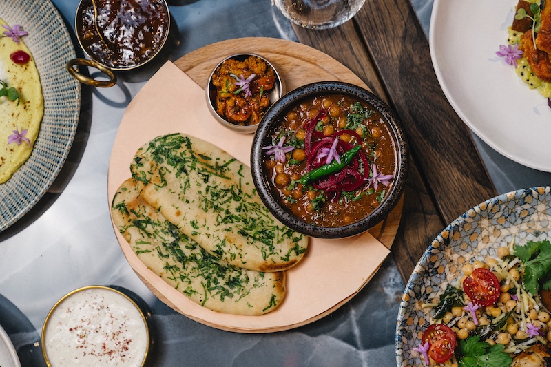 Conceptualized by Abhi Sangwan in just three months, the restaurant opened its doors in November 2024. It was brought to life in collaboration with the Newcastle-based Collective Design studio and the Forty-Eight Point One branding team. From evoking forest mystique in Taj Kutir to channelling the tranquil oceanic depths of Manthan, Sangwan’s concept pays homage to the Indian folklore that weaves a variegated tapestry of nature. Sangwan explains, “The aim was to create an Indian dining concept that immerses guests in the sensory beauty of the Himalayas.” With their tranquil and daunting character, the Himalayan ranges serve as a duo of muse and metaphor, embodying the vigour, malleability, and persistent essence of those who carry its heritage across boundaries.