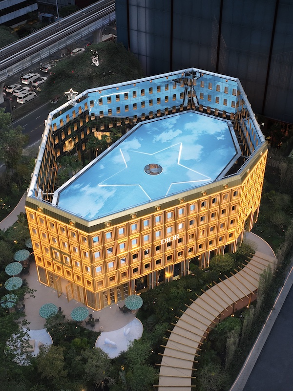 An aerial view of Dior’s Gold House featuring the gardens, a pergola, a mansard roof and a backlit ‘lucky star.’ (Image Credits: Goose Studio)