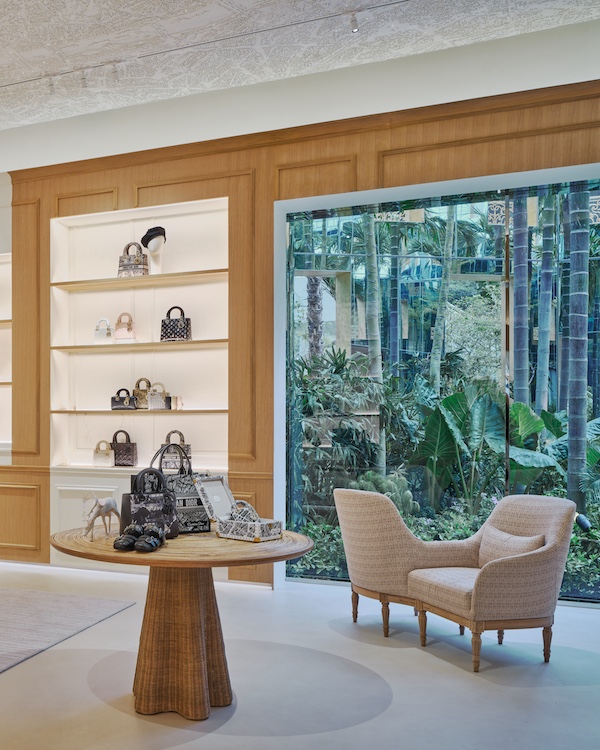 The ‘lucky star’ recurs as a skylight, casting a spotlight at the store’s heart—an open book perched with mannequins—while creating an airy and light ambience. Wooden accents, with intricately carved wicker and pallid walls, define the store’s interiors, illuminated by the colossal French windows. Among the captivating exhibit of ‘Lady Dior’ bags, hiding in plain sight is ‘Mala,’ a gamut of woven bamboo ‘Lady Dior’ bags crafted by Savin Saima of Vassana—a local weaving brand. Adding to the artistic allure is ‘Nirvana D’Oro’ chair by artist Eggarat Wongcharit, which reinterprets Thailand’s traditional mirror mosaic techniques, paired with the dainty table titled ‘Panajon: Wandering in the Forest’ by Sumphat Gallery, seamlessly blending Thai and French artistry.