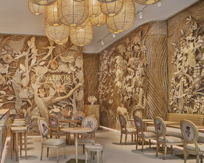 The apparel section pairs seamlessly with ‘Café Dior,’ helmed by three-Michelin-starred chef Mauro Colagreco. The café’s menu balances nature’s bounty while reflecting Dior’s couture legacy, set against artist Korakot Aromdee’s bamboo installation aptly called the ‘Garden of Happiness.’ This enchanting tableau of intricately carved, three-dimensional flora and fauna complements a menu of decadent treats, including ‘Pandan’ with Combava and lime, rose milk with lychee and raspberry, pistachio, vanilla, and passion fruit pastries, as well as cocktails infused with neroli, jasmine, and lavender. “I’m delighted to have contributed to the birth of Café Dior in Bangkok within the Dior Gold concept store, and to have been able to build plural dialogues between the worlds of haute couture and haute gastronomy,” shares Colagreco.
