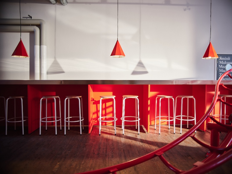 The tangerine table with steel tabletop and bar stools flank the rollercoaster, while the analogous pendant lights infuse the space with a soft light. (Image Credits: Noah Fernström).