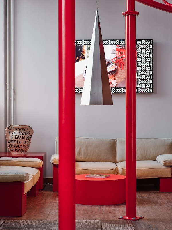 Rising three meters above the ground with supports bolted to the floor, this rollercoaster track is a striking creation crafted from 4000 kgs of deep red-lacquered steel. Its rounded, polished car seats, designed for a solo rider seamlessly integrate into the workspace, blending eccentricity with functionality, complementing the office’s colour palette, and its sleek steel accents.