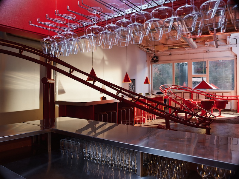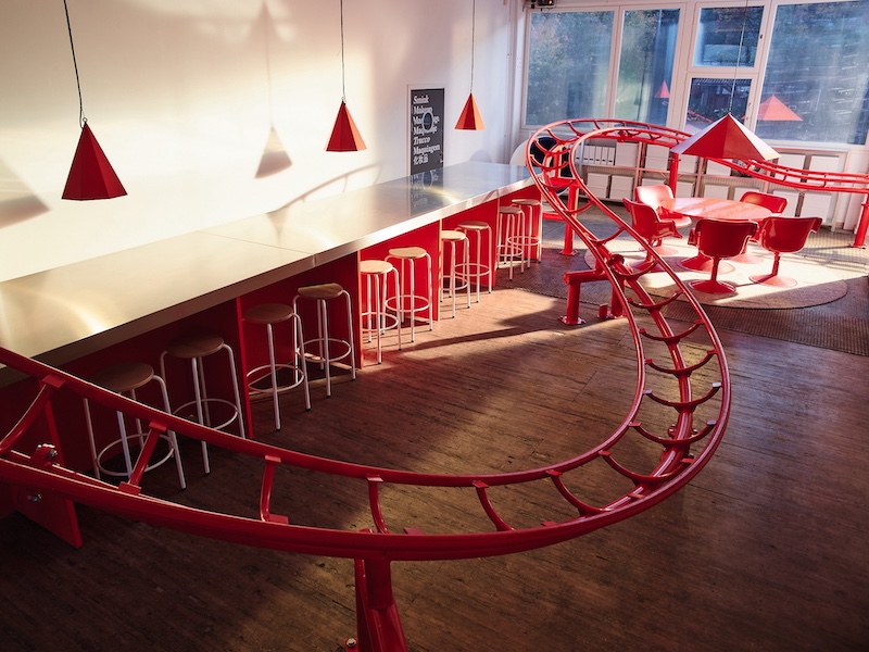 What if, upon entering the office each day, a roller coaster swept you around? As improbable as this idea may seem, it is exactly what unfolds at The Great Exhibition (TGE)—a Stockholm-based creative studio’s office. Winding through the office is the world’s first rollercoaster—a 60-metre-long track monikered ‘The Frontal Lobe.’ Akin to its namesake it adds a dash of playfulness while redefining the mundane office environments. This striking crimson track effortlessly weaves through seating areas, the kitchen and the bar on the ground floor of The Great Exhibition’s Liljeholmen office, creating a seamless blend of work and whimsy.