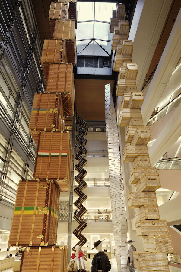 On the bustling streets of Manhattan, across from Louis Vuitton’s flagship in progress, a massive giraffe and flamingo flank a curtain wall adorned with the brand’s monogram, drawing curious glances to the emporium. Inside, a striking zigzag sculpture of stacked trunks by OMA’s Shohei Shigematsu, a New York-based partner of the firm, stretches from the lobby to the fifth-floor ceiling, paying homage to the city’s iconic skyscraper. The first floor showcases leather goods, while the second and third feature women’s and men’s collections, and the fourth is home to Le Café Louis Vuitton—an intimate 70-seat gastronomic experience. The café’s design—a fusion of French Art Deco and Indigenous New York loft aesthetics—features exposed brick walls and muted tones. Towering floor-to-ceiling bookshelves adorn the walls, holding a curated collection of 600-650 tomes focused on New York’s visionary voices and Louis Vuitton’s legacy, curated by renowned editor Ian Luna.