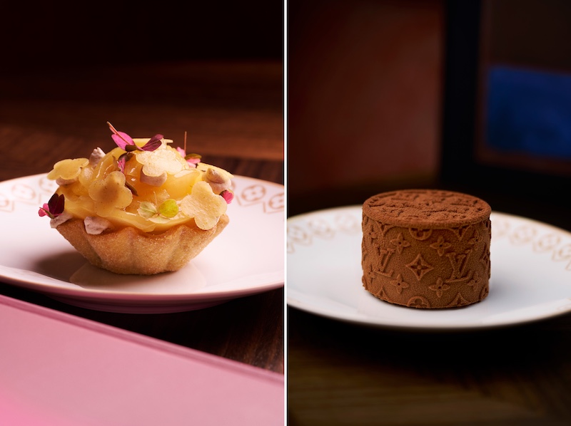 Left: Damier tartlets filled with fresh, seasonal ingredients are a perfect blend of French elegance and vibrant flavours. Right: A decadent chocolate entremet, crafted with 3 exquisite varieties of cocoa: Vietnam 75, Madagascar milk 50, and Peru milk 40. (Image Credits: Courtesy of Louis Vuitton)